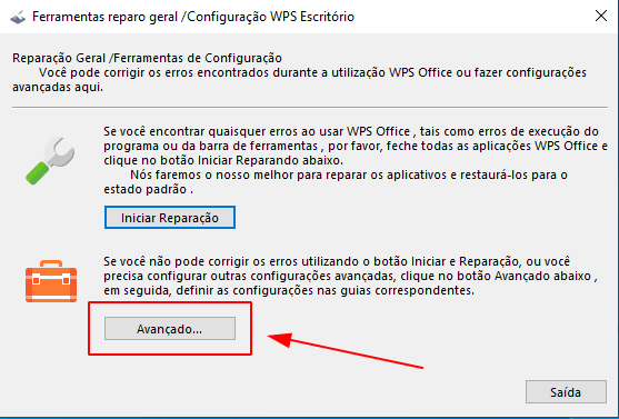 2. Agora clique no aplicativo que apareceu "WPS Office Configuration Tools". Ao clicar irá abrir uma nova janela, nesta clique em "Avançado".